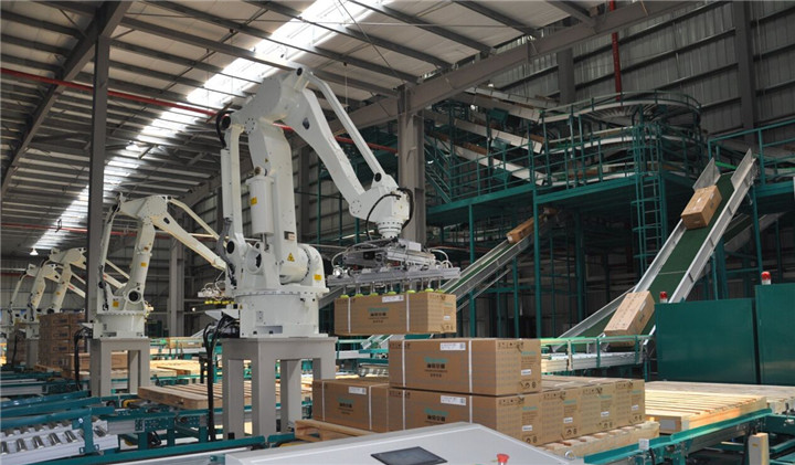 (四)自動(dòng)化下線機(jī):通過機(jī)器人完成自動(dòng)夾取產(chǎn)品、自動(dòng)堆碼、自動(dòng)取夾板等操作,全過程無人化操作,可滿足產(chǎn)品質(zhì)量在150KG內(nèi)的自動(dòng)堆垛,安定效率高。