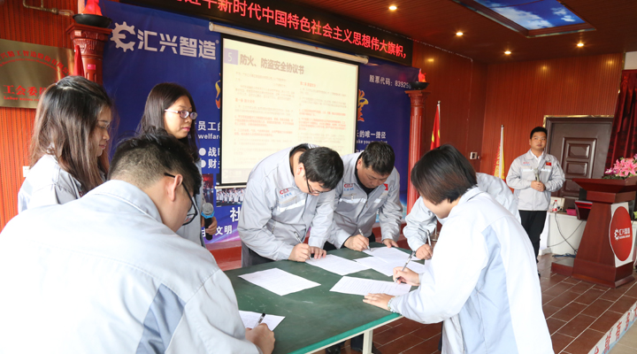 璞玉有瑕,有先進(jìn),就有落后,有表揚(yáng),就有懲戒。沒有規(guī)矩,不成方圓,所以大會的第四個議程對公司管理制度做了進(jìn)一步宣講和引導(dǎo)。人事經(jīng)理袁侃結(jié)合實(shí)際案列,諄諄告誡全體員工遵守法律、行政法規(guī)、公司制度,不要以身試法、以身犯險。并發(fā)起第五個會議議程,倡議匯興智造全體員工簽訂《防火、防盜安全協(xié)議書》,各部門負(fù)責(zé)人率先上臺在協(xié)議書上簽字,用實(shí)際行動表決心。