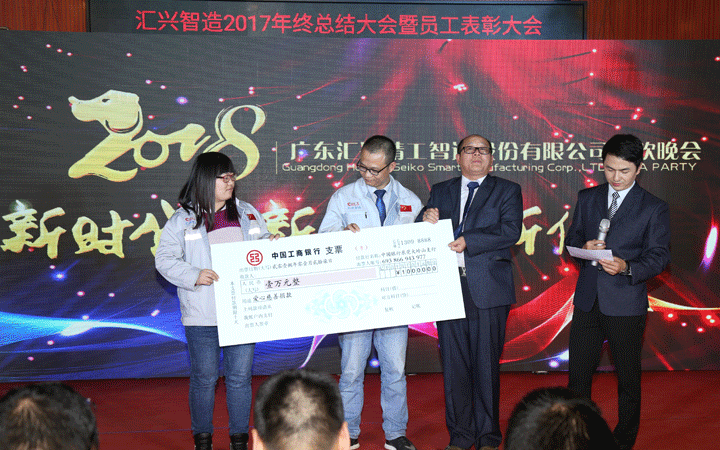 2017年,匯興智造設立了愛心慈善基金會,為家庭生活異常困難的員工及其家屬奉獻愛心。在晚會現(xiàn)場,家庭遇到極大困難的五名員工接受了愛心捐贈。只要人人都獻出一點愛,世界將變成美好的人間。在場的所有人無不被這一善舉感動拭淚。