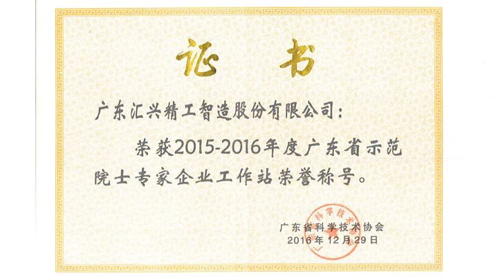匯興智造廣東省示范院士專家企業(yè)工作站榮譽證書