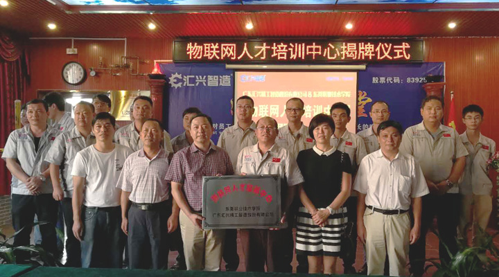 2017年9月27日下午, 東莞職業(yè)技術(shù)學(xué)院副院長楊云奇,計算機(jī)工程系主任胡選子博士,藝術(shù)設(shè)計系主任何鳳梅博士,計算機(jī)系曹文梁教授等專家人員一行蒞臨廣東匯興精工智造股份有限公司(股票代碼:839258)考察調(diào)研并舉行“物聯(lián)網(wǎng)人才培訓(xùn)中心“基地揭牌儀式。匯興智造董事長鐘輝,匯興中德智能制造研究院院長李康順教授熱情接待了調(diào)研組一行。