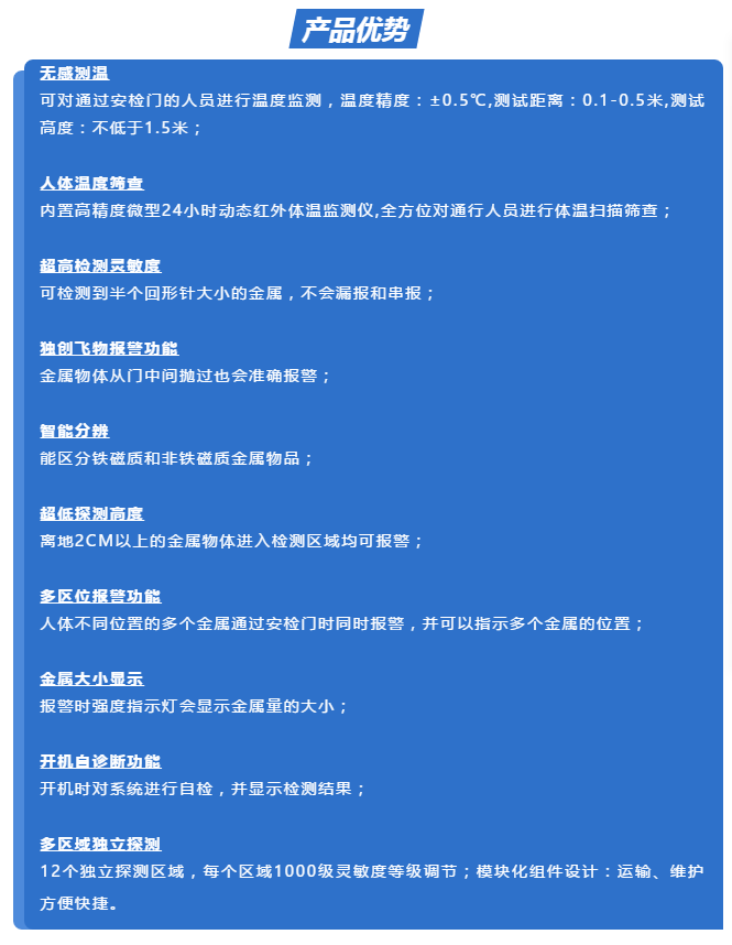 匯興智造人體測溫安檢門將集紅外測溫和金屬檢測為一體化,可對通過安檢門的人員進行溫度測試,如若超過安全溫度閾值將聯(lián)動安檢門聲光報警,有效對人員進行篩查并建立首道防線。