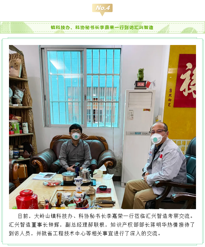 2020年3月11日,市科技局副局長黃天梁、科長李耀球、主任科員劉宇豪蒞臨匯興智造考察市重大科技項目攻關(guān)情況。匯興智造董事長鐘輝、技術(shù)總監(jiān)丁度坤博士、財務(wù)總監(jiān)彭理仕,副總經(jīng)理彭大海及知識產(chǎn)權(quán)部部長蔣明華等項目相關(guān)人員列席了會議。