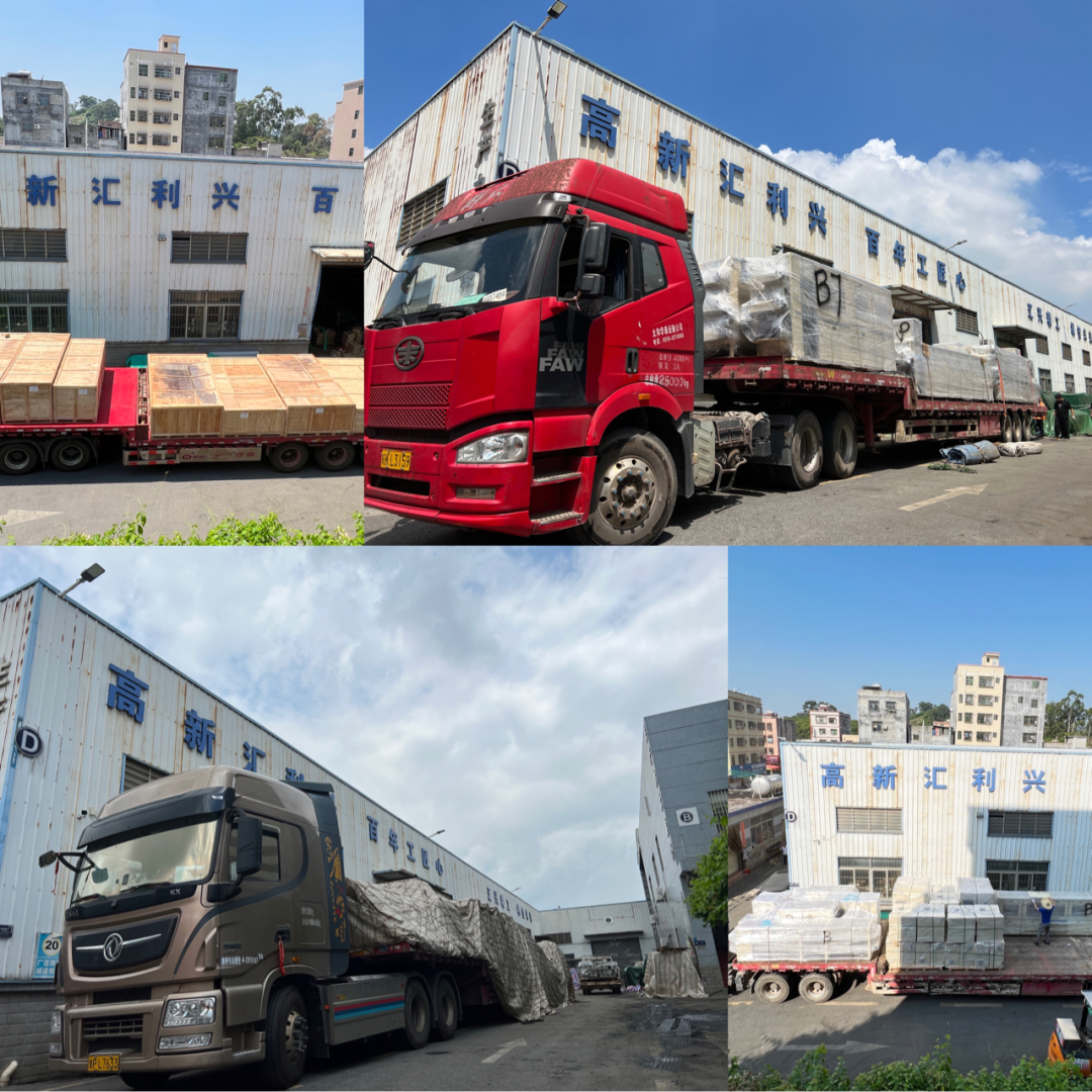 ,待檢查完,滿載貨物的數(shù)輛運輸車緩緩駛出,發(fā)往客戶項目現(xiàn)場。